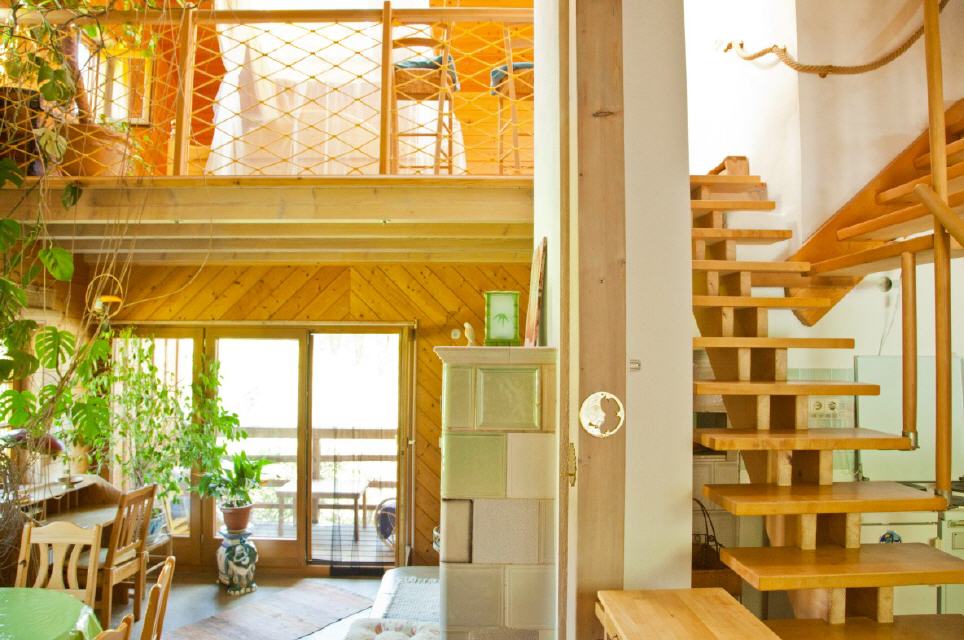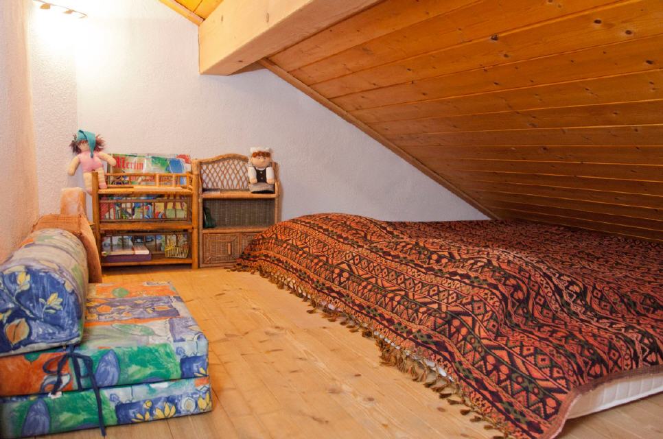 Obere Ebene: Doppelbett auf der lichtdurchfluteten Galerie und weitere Schlafplätze in der Kindernische.