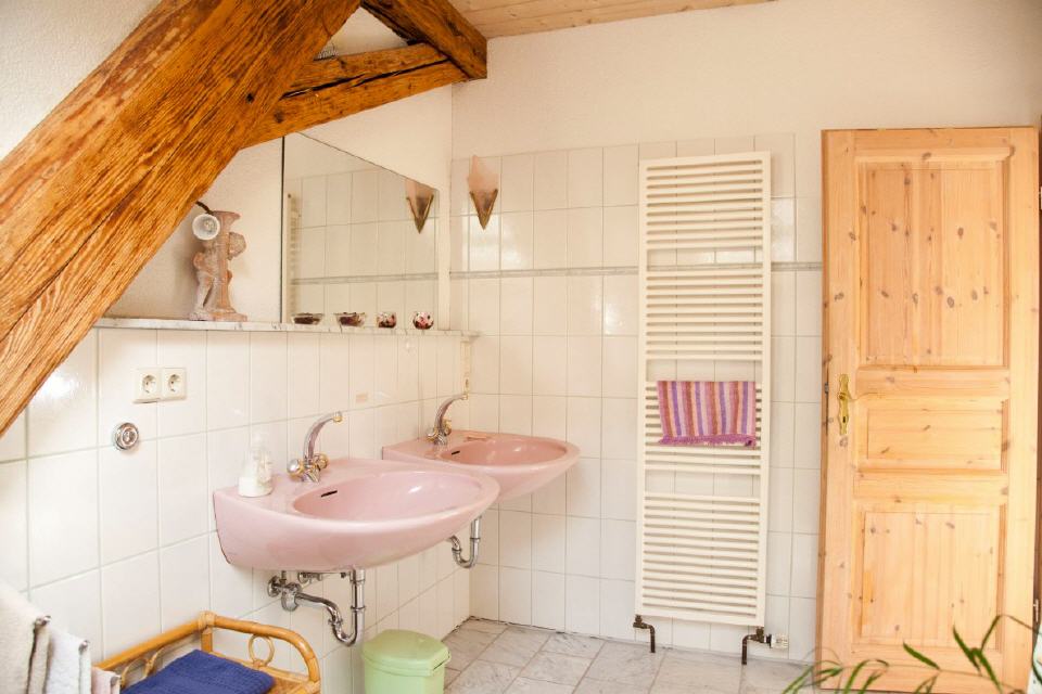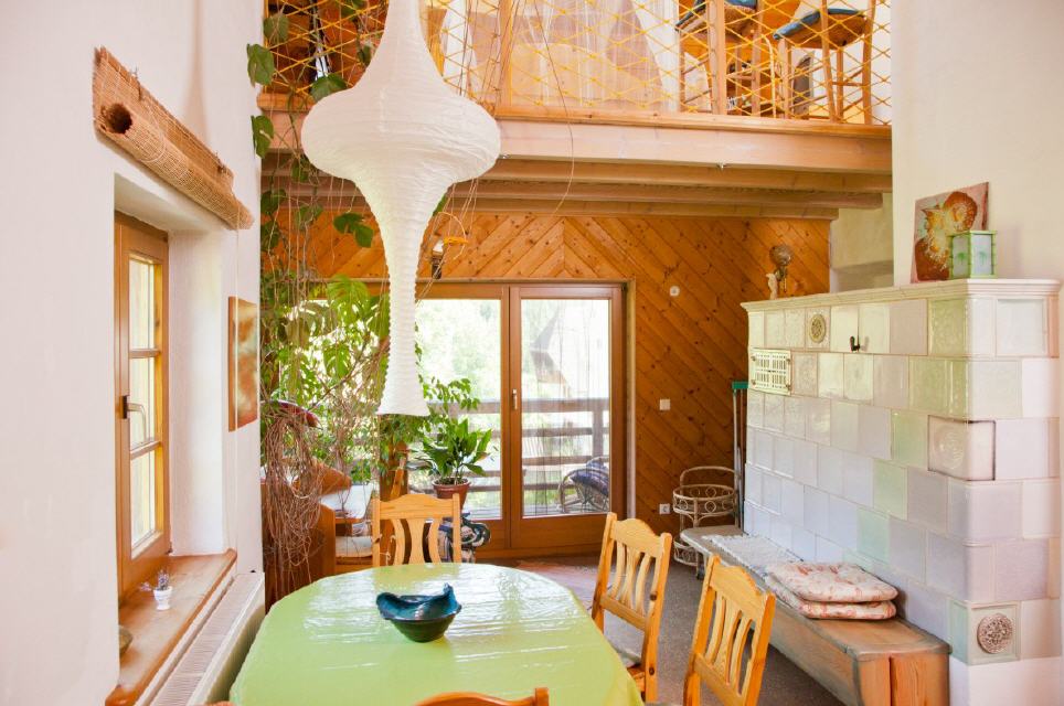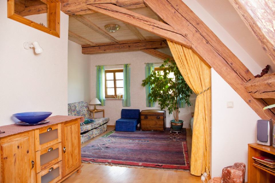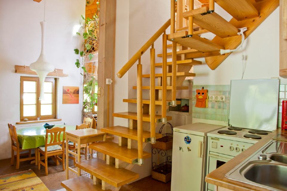 Sich Ruhe gönnen... bei uns im liebevoll baubiologisch restaurierten, über 200 Jahre alten Natursteinhaus mit hellen 2-Etagen-Wohnungen, den Balkonen, Vollholzküchen, Kork- und Holzparkettböden. Idyllisch am Südhangwaldrand gelegen ist es perfekt für Wanderungen vor Ort, zum Entspannen am Teich, der Feuerstelle (mit Schafen und Katze) dem Spielplatz, Rutsche, Schaukel und großem Trampolin. Hier bieten wir 2 Ferienwohnungen. Sie liegen in unserem Haus (unsere Wohnung ist im Erdgeschoss). Die "kleine Wohnung" liegt im ersten Stock und die "große Wohnung" im zweiten (ausgebauter Dachstuhl). Sie sind selbstverständlich komplett eingerichtet.