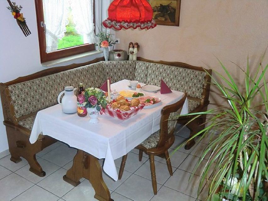 Eckbank mit Tisch und Stuhl.