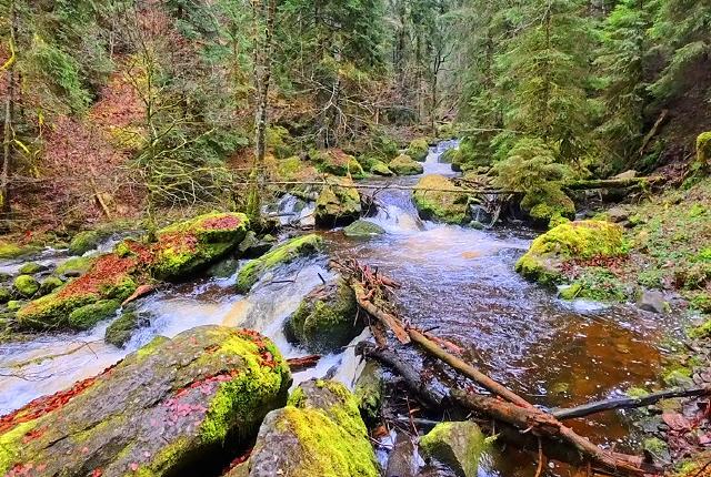 Die Wolfschlucht bei Calw ist eine faszinierende Fels- und Wasserfallschlucht im Nordschwarzwald. Bei der Wolfschlucht zwischen Ernstmühl und Ottenbronn handelt es sich um eine wildromantische, anspruchsvolle Schlucht mit einer Länge von etwa 2 km. Allerdings ist die Begehung nur guten Wanderern zu empfehlen. An einigen Stellen ist Vorsicht geboten; es besteht Absturzgefahr. Bild antippen!