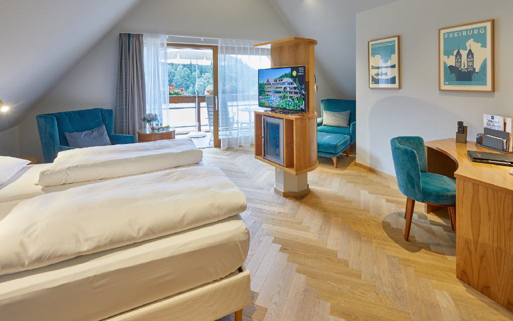 Doppelzimmer Münstertal. Doppelzimmer 42 qm, Balkon 8 qm, Waldseite mit Morgensonne. Der dezent-exquisite Einrichtungsstil gibt auch hier den Ton an: Harmonische Leichtigkeit in einer warmen Atmosphäre sorgt für Erholung ab dem ersten Augenblick. Der große Balkon lädt zum Frühstück in der Morgensonne ein und verspricht an heißen Sommertagen angenehme Kühle. Besondere Ausstattungsmerkmale: zum Teil überlange Betten (210 x 180 cm), separate Toilette und begehbare Ankleide.