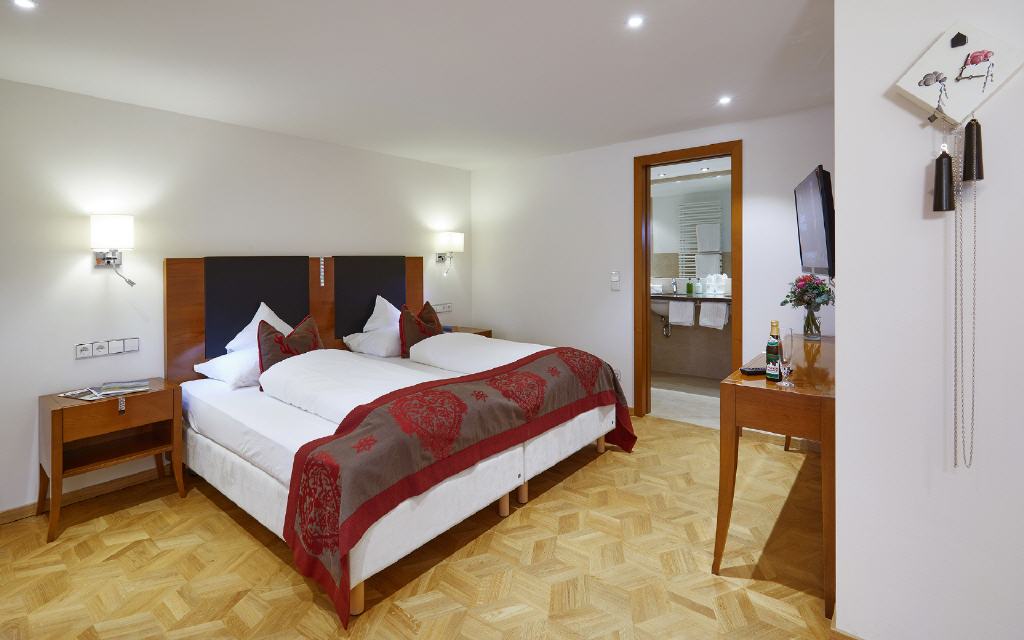 Doppelzimmer Bärental. Doppelzimmer, ca. 32 qm, möblierter Balkon 6 qm, Südwestseite zum Garten. Hier empfängt Sie die Erholung schon beim Eintreten: Eingekuschelt im Bett oder auf dem Balkon lassen Sie sich im Doppelzimmer Bärental von der Nachmittagssonne wärmen. Den Ausblick auf unsere gepflegte Gartenanlage gibt es gratis dazu. Die hochwertigen Echtholzböden und geschmackvollen Kirschbaum-Möbel strahlen ein edles und zugleich warmes Flair aus.