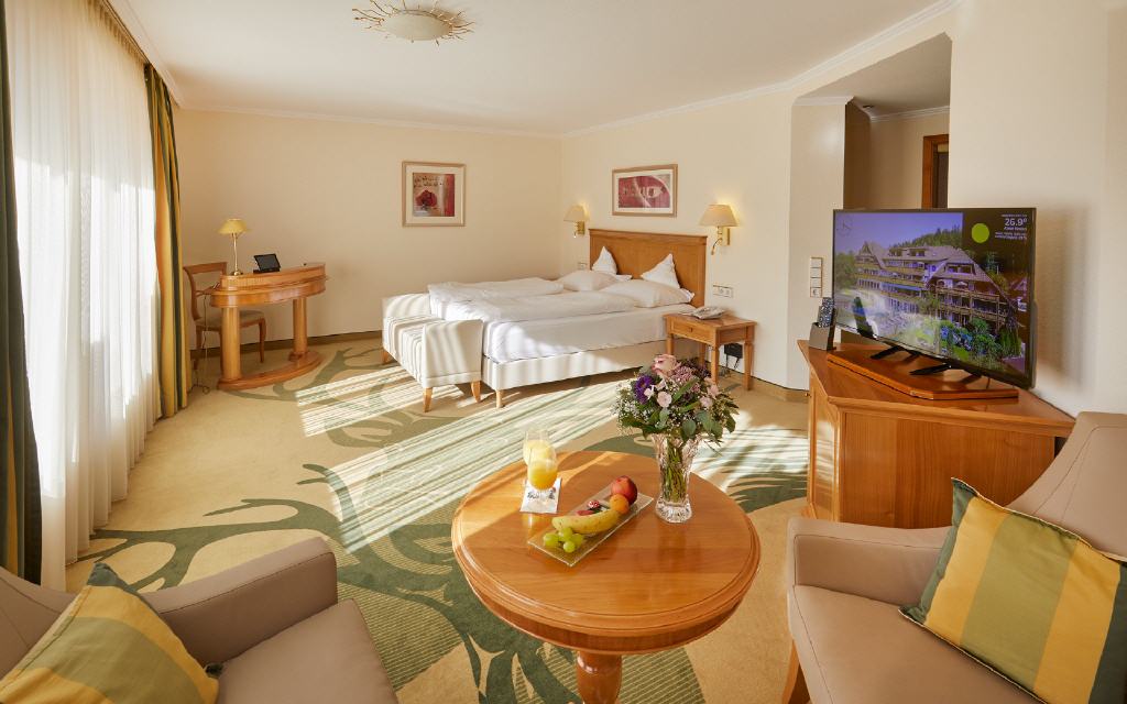 Junior-Suite Glottertal. Junior-Suite, 48 qm, möblierter Balkon 12 qm oder Loggia 6 qm, Südwestseite zum Garten, mit Nachmittags- und Abendsonne. Das Interieur dieser beiden Suiten verzaubert Sie mit geschmackvollem Landhausstil gepaart mit modernem Edel-Touch: Die Suiten Glottertal bestichen durch ihre unaufdringliche Behaglichkeit in einem perfekt abgestimmten Mix aus charmanten Stilelementen. Warme Hölzer und heitere Farben schaffen ein behagliches Wohn-Ambiente. Ein geräumiges und ruhiges Doppelzimmer mit Nachmittags- und Abendsonne, das Ihnen einen herrlichen Blick auf die gepflegten Gartenanlagen gewährt.