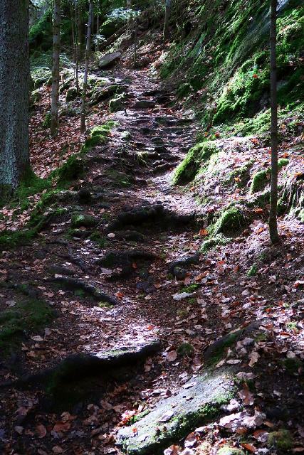Gut versteckt inmitten eines alpin anmutenden und idyllischen Waldgebiets liegt die imposante Burgruine Falkenstein, die auf die untere und die obere Falkenstein aufgeteilt ist. Es ist beeindruckend, wie die Ruinen mit den groben Felsen verbaut sind.