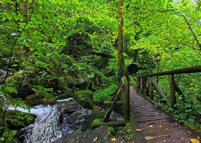 Fast jedes Schwarzwaldtal hat seine Wasserfälle, so auch Sasbachwalden. Die Gaishölle ist ein besonderer Ort. Kaskadenartig fällt der Brandbach ins Tal hinunter. Diese wildromantische Schlucht bei Sasbachwalden mit riesigen Felsen und Findlingen erwandert man am besten bei einer Tour auf dem Premiumweg. Bei einem Höhenunterschied von rund 200 Metern und 13 Brücken geht es hinauf zum Ortsteil Bischenberg / Hörchenberg. Bild antippen!